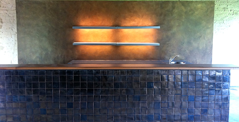 This bar at Wild Geese has been given a brown and golden colour wash on the wall. This colour wash has been worked to match the tiles infront of the bar.